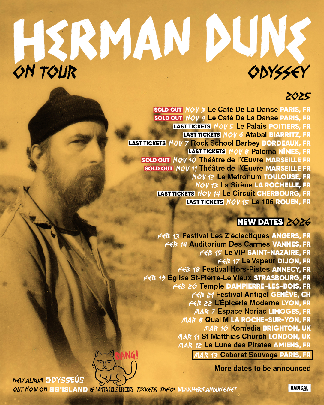 Heureux qui comme Herman Dune, continue son beau voyage : David Ivar vous donne rendez-vous en 2026 pour la suite de son épopée live héroïque en solo à travers l’Europe et le Royaume-Uni, et notamment le 13 mars au Cabaret Sauvage, à Paris ! Notre monument anti-folk national défendra sur scène "Odysseús", un voyage musical intime au fil de son existence tumultueuse, disponible depuis le 13 juin 2025 via Santa Cruz Records.
